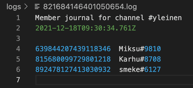 Testausserveri ry's use-case for such bot is to track present members of an association's meeting for a record. We paste the generated data to a spreadsheet, which matches an user id to a real name. The final list of participants can be included in the minutes of the meeting.